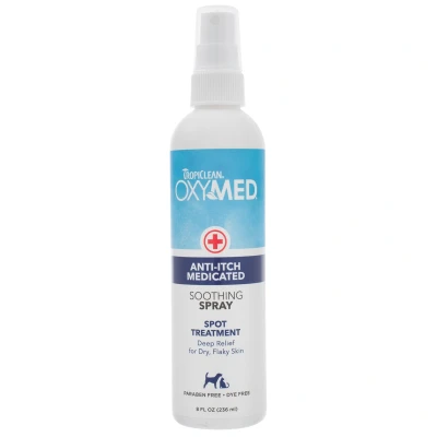 JoybuyTropiClean OxyMed Medicated Anti Itch Spray for Pets provides fast relief from itching, redness, and flaky skin with a gentle, medicated formula featuring Alpha and Beta Hydroxy, Colloidal Oatmeal, and vitamins. Free of parabens and dyes, it soothes sensitive skin without interfering with spot-on treatments.