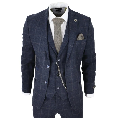 Sharp, sleek and sophisticated, look the part with this premium 3 piece Navy Blue tweed suit, that features a slim fit cut, with a closer fit across the chest and narrower tailored trousers. the two-button jacket hangs beautifully and has a half canvas construction that moulds to your body shape the more you wear it. Contrasting flap pockets, buttoned cuffs and a single back vent lend the suit a classic touch of refinement. A matching tweed waistcoat completes the 3-piece with a single breasted down style with classic tailored pockets and a back adjuster to ensure you can create your ideal fit. The suit is evergreen and contemporary at the same time and allowing you to look the best all day. Pair it with a matching waistcoat, a white shirt and shoes for a dapper finish.Perfect For Any Smart Formal Traditional Vintage Retro Themed Occasions, Such As Weddings, Proms Or Parties!Tailored Fit (inbetween Slim & Regular) Many More Styles & Colours Available in Store!