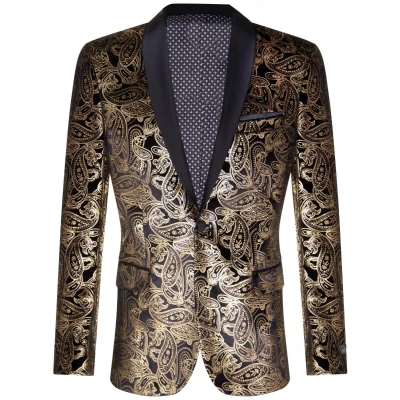 Sharp, sleek and sophisticated, look the part with this premium Velvet Blazer. Finished In Stunning Gold Paisley with Contrasting Black Satin Peak Lapels & Matching Satin Buttons Featuring a Classic Retro Black Satin Round Shawl Lapel.* Perfect Tuxedo Dinner Jacket To Truly Stand Out From The Crowd, Ideal For All Formal Occasions Such As Wedding, Proms, Parties & Black Tie Events.Tailored Fit (inbetween slim & regular fit), Many More Styles & Colours Available in Store!