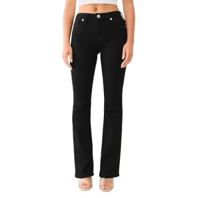 True Religion Women's Becca Mid Rise Boot Cut Single Needle Stitching Jean offers a timeless silhouette with a contemporary edge Crafted with precision and quality, these jeans feature a flattering mid-rise waist and a bootcut leg, creating a sleek and elongated look The black body rinse adds depth and versatility to your wardrobe, seamlessly transitioning from casual outings to evening events Detailed with signature True Religion stitching on the back pockets, these jeans exude an authentic, fashion-forward vibe Whether paired with a cozy sweater for a laid-back weekend or dressed up with heels and a blouse, these jeans epitomize effortless style and confidence