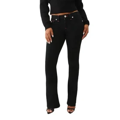 Flared silhouette with mid-rise waist Crafted from black super stretch denim for all-day comfort Features natural damask labels and dull nickel hardware