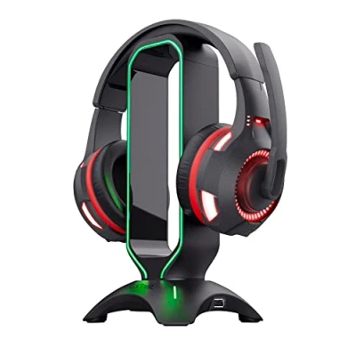 THE FINAL PIECE – Complete your gaming setup and keep your desk free from clutter with the stylish Cintar Headset Stand GO BRIGHT – Give your gaming desk a fresh look with LED RGB illumination that's sure to turn heads STABLE AND SECURE – A weighted design and non-slip rubber feet mean stability is the name of the game ONE-SIZE-FITS-MOST – A near-universal design is suitable for all headsets up to 215mm USB TIMES TWO – Two USB-A ports let you charge or connect other devices, accessories, or peripherals