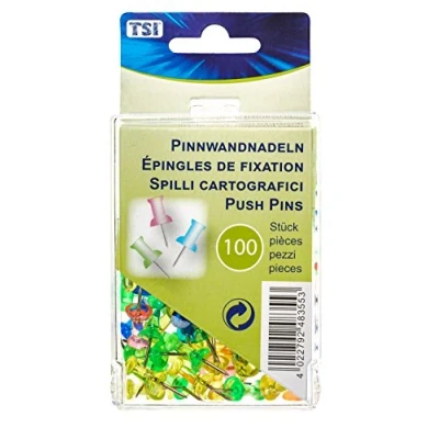 TSI 48355 Transparent Colourful Plastic Push Pins Pack of 100 in a Handy Storage Box