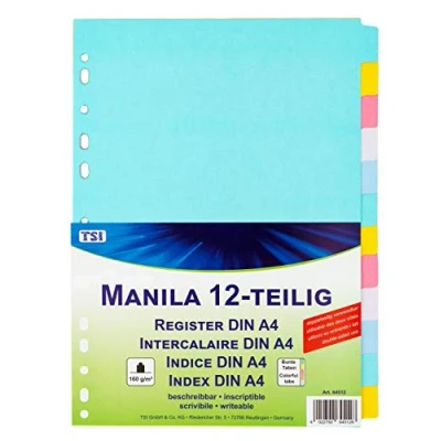 12 sheets in 5 different colours in one pack Index made of sturdy Manila cardboard (160 g/m²) Writeable blank tabs Without cover sheet Size DIN A4 Universal perforation