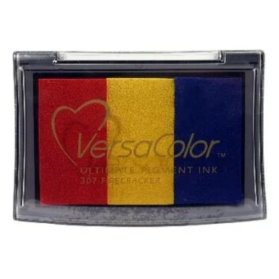 Firecracker Versacolor 3 Colour Pigment Ink Pad for Stamps (Scarlet Canary Royal Blue). Versacolor uses the highest quality raw materials including a superior ink recipe a stackable container with an ultra-dense foam pad for crisper stamped images.. V To aid your keyword search this product has been categorised as Christmas and Wedding. Raised pad size 76mm x 46mm. Application - Uncoated paper. Drying time - 10 to 15 minutes on uncoated papers. Varies based on weight / type of paper, humidity, etc.. Embossing - Very suitable since it dries slowly. (recommended to use transparent embossing powder). An exceptionally large colour line ensures you have the perfect colour every time.. Fade resistant, traditional pigment ink.. VC3-307
