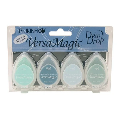 VersaMagic 4 Piece Set Seashore. The perfect chalk pigment ink that dries beautifully on any color cardstock- even dark cardstock! Soft, opaque, chalk-like look with none of that chalky residue.. VersaMagic is a softly opaque pigment ink that dries into a delicate chalky finish.. Use for cardmaking, journals, scrapbooks and more. Ideal for stamping and stencilling. Can be used on paper, vellum, shrink plastic, polymer clay, wood and leather. Comes in a palette of soft, delicate and richly-hued colours. These pads feature a substantially raised inkpad surface to accommodate even the largest stamps without interference from the inkpad case. Fast drying and highly fade-resistant. Archival and acid-free. VersaMagic is available in full-size inkpads, Dew Drop inkpads and Inkers. Not all colours are available in all product forms. Water-based; archival and acid free. VersaMagic Dew Drop inkpads: 1.25 x 2 inches (32 x 50mm). Video Introduction: VersaMagic Chalk-finish Pigment Ink. GD-100-005