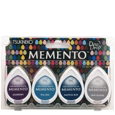 Memento 4 Piece Set Dolphin Play. Memento dye ink is fast drying and fade resistant. The innovative pad delivers finer impressions and exceptionally even coverage.. Application - Coated paper, vellum, uncoated paper, printer paper. Drying time - 3 to 5 seconds on coated paper. Virtually instant on uncoated papers. Varies based on surface / material, humidity, etc.. Particularly for glossy vellum and coated paper are suited for reproducing fine detail and lines.. Dries very quickly for regular paper like New Years Greeting post cards and schedule stamps.. Brilliancy of the ink is more obvious than regular dye ink resist for water and light.. Memento Dew Drop is suited for colouring the boarder lines and fine detail art works.. Can be used with ink blender for shading and spray effect. *please refer to ink blender.. It is possible to mix with inker.. L size Memento comes with the sticker on side of the cover for easy identification. MD-100-018