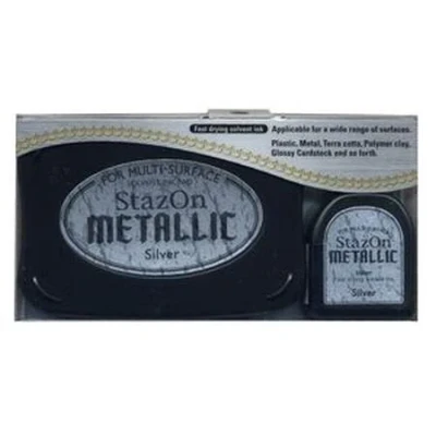 Silver - StazOn Metallic Ink Pad. Solvent pad for multi surfaces.. StazOn inkpads are the industry leader in multi-surface stamping; StazOns highly versatile inks adhere to most acetate, acrylic, metal, leather, shrink plastic, cellophane, plastic and glass. StazOn inks also work great on paper!. Use for wide range of mixed media projects, card making, memory albums, home and office decor, and an endless creative universe of other projects. Available in full-size inkpads, inkers and wide mouth bottles in a wide range of colours. These pads feature a substantially raised inkpad surface to accommodate even the largest stamps without interference from the inkpad case. StazOn is offered in its original translucent finish, in StazOn Opaque for a more opaque finish and as StazOn Metallic for a metallic finish. StazOn Opaque and Metallic pads come in a kit containing an un-inked pad an Inker bottle. Archival and acid free. Video Link: An introduction to StazOn Ink. SZ-000-192