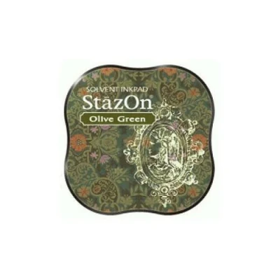 Olive Green Stazon Midi Ink Pad.. Application: Plastic, metal, shrink plastic, rubber, leather, polymer clay, laminated paper, coated paper, uncoated paper, photo, glass, porcelain, terracotta, cellophane. Solvent Ink,. Use for wide range of mixed media projects, card making, size 58 x 58 x 20 (mm). memory albums, home and office decor, and an endless creative universe of other projects. Available in full-size inkpads, inkers and wide mouth bottles in a wide range of colours. These pads feature a substantially raised inkpad surface to accommodate even the largest stamps without interference from the inkpad case. StazOn is offered in its original translucent finish, in StazOn Opaque for a more opaque finish and as StazOn Metallic for a metallic finish. StazOn Opaque and Metallic pads come in a kit containing an un-inked pad an Inker bottle. Archival and acid free. size 58 x 58 x 20mm. Video Link: An introduction to StazOn Ink. SZM-51