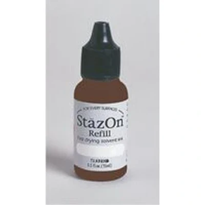 Timber Brown StazOn Ink.. StazOn is a solvent-based ink designed for decorating non-porous surfaces such as glass, metal, shrink plastic, cellophane, aluminium, foil, leather and acrylic. 0.5floz (15ml).. StazOn inkpads are the industry leader in multi-surface stamping; StazOns highly versatile inks adhere to most acetate, acrylic, metal, leather, shrink plastic, cellophane, plastic and glass. StazOn inks also work great on paper!. Use for wide range of mixed media projects, card making, memory albums, home and office decor, and an endless creative universe of other projects. Available in full-size inkpads, inkers and wide mouth bottles in a wide range of colours. These pads feature a substantially raised inkpad surface to accommodate even the largest stamps without interference from the inkpad case. StazOn is offered in its original translucent finish, in StazOn Opaque for a more opaque finish and as StazOn Metallic for a metallic finish. StazOn Opaque and Metallic pads come in a kit containing an un-inked pad an Inker bottle. Archival and acid free. Video Link: An introduction to StazOn Ink. RZ-41