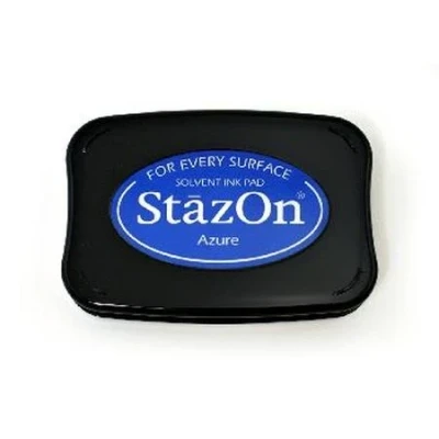 Azure StazOn Ink Pad for Stamps. Size 3.75 x 2.625 inches (96 x 67 mm).. StazOn inkpads are the industry leader in multi-surface stamping; StazOns highly versatile inks adhere to most acetate, acrylic, metal, leather, shrink plastic, cellophane, plastic and glass. StazOn inks also work great on paper!. Use for wide range of mixed media projects, card making, memory albums, home and office decor, and an endless creative universe of other projects. Available in full-size inkpads, inkers and wide mouth bottles in a wide range of colours. These pads feature a substantially raised inkpad surface to accommodate even the largest stamps without interference from the inkpad case. StazOn is offered in its original translucent finish, in StazOn Opaque for a more opaque finish and as StazOn Metallic for a metallic finish. StazOn Opaque and Metallic pads come in a kit containing an un-inked pad an Inker bottle. Archival and acid free. Video Link: An introduction to StazOn Ink. SZ-95