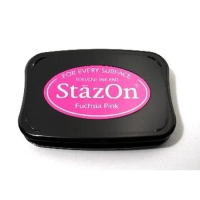 Fuchsia Pink StazOn Ink Pad for Stamps. Size 3.75 x 2.625 inches (96 x 67 mm).. StazOn inkpads are the industry leader in multi-surface stamping; StazOns highly versatile inks adhere to most acetate, acrylic, metal, leather, shrink plastic, cellophane, plastic and glass. StazOn inks also work great on paper!. Use for wide range of mixed media projects, card making, memory albums, home and office decor, and an endless creative universe of other projects. Available in full-size inkpads, inkers and wide mouth bottles in a wide range of colours. These pads feature a substantially raised inkpad surface to accommodate even the largest stamps without interference from the inkpad case. StazOn is offered in its original translucent finish, in StazOn Opaque for a more opaque finish and as StazOn Metallic for a metallic finish. StazOn Opaque and Metallic pads come in a kit containing an un-inked pad an Inker bottle. Archival and acid free. Video Link: An introduction to StazOn Ink. SZ-82