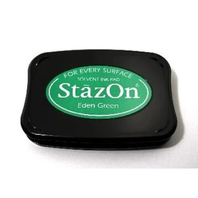 Eden Green StazOn Ink Pad for Stamps.. StazOn inkpads are the industry leader in multi-surface stamping; StazOns highly versatile inks adhere to most acetate, acrylic, metal, leather, shrink plastic, cellophane, plastic and glass. StazOn inks also work great on paper!. Use for wide range of mixed media projects, card making, memory albums, home and office decor, and an endless creative universe of other projects. Available in full-size inkpads, inkers and wide mouth bottles in a wide range of colours. These pads feature a substantially raised inkpad surface to accommodate even the largest stamps without interference from the inkpad case. StazOn is offered in its original translucent finish, in StazOn Opaque for a more opaque finish and as StazOn Metallic for a metallic finish. StazOn Opaque and Metallic pads come in a kit containing an un-inked pad an Inker bottle. Archival and acid free. Video Link: An introduction to StazOn Ink. SZ-53