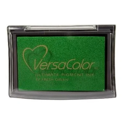 Fresh Green Versacolor Pigment Ink Pad for Stamps. Versacolor combines the highest quality raw materials including a superior ink recipe a stackable container with a unique hinged lid and an ultra-dense foam pad for crisper stamped images.. VC1-22 To aid your keyword search this product has been categorised as Christmas and Wedding. Raised pad size 76mm x 46mm. Application - Uncoated paper. Drying time - 10 to 15 minutes on uncoated papers. Varies based on weight / type of paper, humidity, etc.. Embossing - Very suitable since it dries slowly. (recommended to use transparent embossing powder). An exceptionally large colour line ensures you have the perfect colour every time.. Fade resistant, traditional pigment ink.. VC1-22