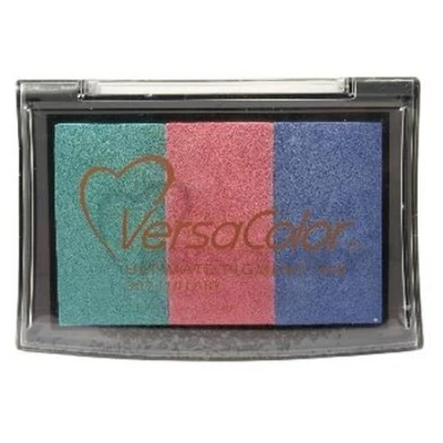 Lullaby Versacolor 3 Colour Pigment Ink Pad for Stamps (Seafoam Petal Pink Baby Blue). Versacolor uses the highest quality raw materials including a superior ink recipe a stackable container with an ultra-dense foam pad for crisper stamped images.. VC To aid your keyword search this product has been categorised as Christmas and Wedding. Raised pad size 76mm x 46mm. Application - Uncoated paper. Drying time - 10 to 15 minutes on uncoated papers. Varies based on weight / type of paper, humidity, etc.. Embossing - Very suitable since it dries slowly. (recommended to use transparent embossing powder). An exceptionally large colour line ensures you have the perfect colour every time.. Fade resistant, traditional pigment ink.. VC3-309