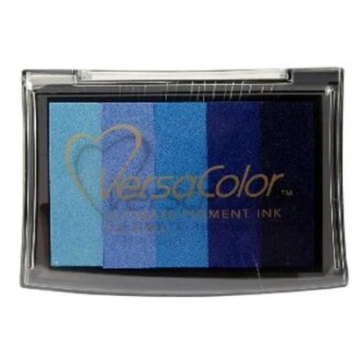 Icicle Versacolor 5 Colour Pigment Ink Pad for Stamps (Pale Blue Sky Blue Cyan Royal Blue Indigo). Versacolor uses the highest quality raw materials a stackable container with an ultra-dense foam pad for crisper stamped images.. VC5-505 To aid your keyword search this product has been categorised as Christmas and Wedding. Raised pad size 76mm x 46mm. Application - Uncoated paper. Drying time - 10 to 15 minutes on uncoated papers. Varies based on weight / type of paper, humidity, etc.. Embossing - Very suitable since it dries slowly. (recommended to use transparent embossing powder). An exceptionally large colour line ensures you have the perfect colour every time.. Fade resistant, traditional pigment ink.. VC5-505
