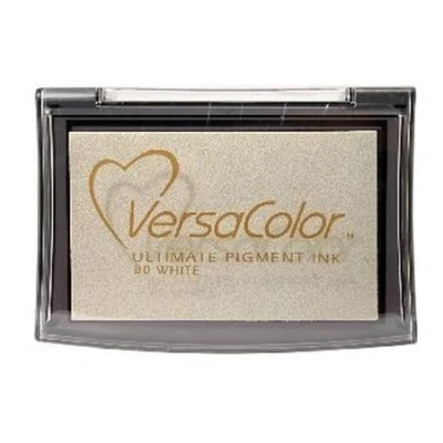 White Versacolor Pigment Ink Pad for Stamps. Versacolor combines the highest quality raw materials including a superior ink recipe a stackable container with a unique hinged lid and an ultra-dense foam pad for crisper stamped images.. VC1-80 To aid your keyword search this product has been categorised as Christmas and Wedding. Raised pad size 76mm x 46mm. Application - Uncoated paper. Drying time - 10 to 15 minutes on uncoated papers. Varies based on weight / type of paper, humidity, etc.. Embossing - Very suitable since it dries slowly. (recommended to use transparent embossing powder). An exceptionally large colour line ensures you have the perfect colour every time.. Fade resistant, traditional pigment ink.. VC1-80