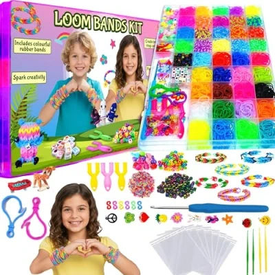 Complete 6000+ Loom Bands Craft Kit Includes over 6000 colorful loom bands along with essential tools and accessories for making bracelets, necklaces, charms, and creative jewelry designs. Wide Variety of Accessories Included Kit includes 1 loom board, 2 Y slingshots, 1 big crochet hook, 3 small crochet hooks, 100 S-clips, tassels, rubber pendants, fruit beads, pony beads, letter beads (black and colorful), connectors, bracelet tubes, funnels, glitter jars, sticker sheets, and cleaning stick. Organized Storage Box All items come neatly packed in a compartmentalized storage box, keeping accessories organized and easy to access while preventing mess and loss. Encourages Creativity & Skill Development Supports creativity, imagination, hand-eye coordination, and fine motor skills through fun DIY bracelet and jewelry-making activities. Ideal Gift for Kids A great choice for birthdays, holidays, school activities, craft time, and creative play for girls and boys who enjoy hands-on arts and crafts.
