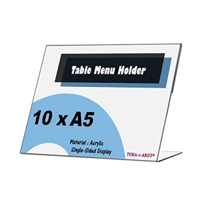 [ 10er Pack ] A5 clear sign holder counter top poster holder, landscape orientation, fit A5 sizes poster, photo or sign. An elegant and professional solution for displaying information such as promotions, instructions, customer notice, menus, drink lists or photographs etc.. Perfect for usage in business, office, home, restaurant, clothing store, reception areas, trade show or exhibit. [ Easy to use ] Simply slide the paper into the display stand frame. No assembly required. Also easy to clean. This poster holder stands on its own without being mounted to the wall. [ Clear Acrylic Material ] Table-top single-sided presentation stand made from high-quality clear acrylic material, best display of information, not easy to break, UV-resistant, long Lasting, very durable and sturdy. [ Professional angled design ] this sign holder use angeled designe, not only easy and comfortable read of information for viewer, but also easy to attract attention of prospective clients. [ in many types / sizes / combinations ] TUKA-i-AKUT acrylic table information stands are available in different types, sizes and combinations. Find more by visiting our amazon shop or clicking on our trademark "TUKA-i-AKUT" under product title.