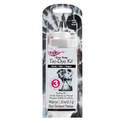 The Tulip One-Step Black Tie-Dye Kit is perfect for allover color, one-color tie-dye effects or adding to your tie-dye party extras! Stocked with 1 bottle of Black One-Step Dye, supplies and an inspiration guide, this kit is ready for your creativity. Who knew tie dyeing could be this easy? Kit includes enough tie-dye supplies to create up to 3 projects Makes up to 4 fl. oz. of dye Features 1 easy-squeeze bottle of highly-concentrated nontoxic One-Step Dye, 1 pair of gloves and 1 set of rubber bands Step-by-step technique guide features over 8 tie-dye looks to choose from No need to presoak fabrics in soda ash before dyeing Dye is safe to machine wash color stays bright and bold through repeated washings Use with 100% natural fiber fabrics like cotton, rayon and wool for best results Perfect for solo projects and adding to your tie-dye party extras Note: project count will vary based on size of garment and amount of dye used. Dyes will appear darker on damp fabric prior to washing and will naturally lighten after laundering. IL21764 IL21764 MPN 21764