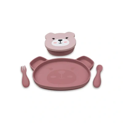 TUM Baby Dinner Set For Weaning Designed with Feeding Specialist Includes Silicone Divided Suction Plate, Lidded Bowl and Cutlery 6m+ Dishwasher Safe, BPA Free Betsy Bear Pink