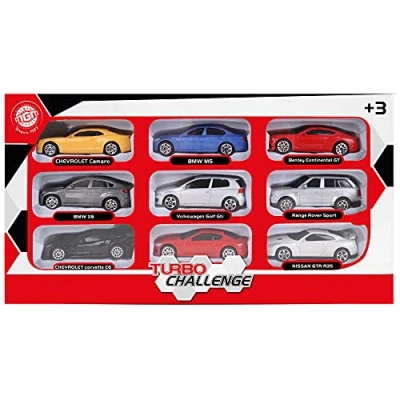 Full Gas: This set of 9 cars (Maserati Granturismo / Aston Martin Vantage 2018 / Lamborghini Gallardo LP570-4 Superleggera 2018 / Mercedes Benz AMG GT S / Lamborghini Murcielago LP670-4 SV 2019 / Audi R8 / BMW X6. / Land Rover / Range Rover Sport / Bentley Continental GT 2018 will provide hours of fun for all budding riders. PACKAGE INCLUDED - The box contains an assortment of 9 cars. It measures 28cm x 4cm x 15cm. For playing in and outside: can be used both indoors and outdoors, this assortment of 9 cars is the ideal toy to play alone or for several hours of use. A GREAT GIFT: Sturdy and timeless, this 9 piece car assortment is the perfect gift for young car lovers or lovers. On wheel hats: Speed, adventures and strong feelings, this is what the many vehicles developed by Turbo Challenge offer small riders., Manufacturer: MGM