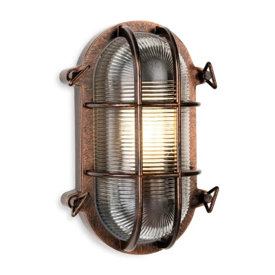 The Firstlight Turin Oval Outdoor Wall Bulkhead is a substantial and characterful fixture that delivers a bold, retro industrial look to any exterior space. Finished in a rich antique copper and crafted from robust die-cast aluminium, this bulkhead offers immense aesthetic appeal alongside superior durability. The design is reinforced with a cage protector and features a toughened, ribbed clear glass diffuser, ensuring reliable, widespread illumination. Ideal for coastal properties, commercial premises, or modern homes seeking a distinctive outdoor wall light, the Turin makes an immediate and lasting impression.Engineered for the toughest environments, the Turin Oval Bulkhead boasts an exceptional IP65 rating, providing complete protection against dust ingress and high-pressure water jets. This rating makes it one of the most durable outdoor lighting solutions available, guaranteeing peak performance regardless of the weather. It requires one standard E27 GLS bulb (maximum 60W, sold separately). For optimal longevity and to complement its vintage styling, we recommend pairing it with a decorative E27 LED filament bulb. Switching to energy-efficient LED lighting not only enhances its striking design but also significantly reduces maintenance and running costs.Bring a touch of rugged, maritime-inspired style to your garden, garage, or entryway with the dependable Turin Bulkhead. Its unique antique copper finish and high IP65 rating ensure it is suitable for demanding conditions while enhancing your property's character. Shop now at SimplyLED to secure this premium, high-durability fixture and choose your perfect E27 bulb to complete this truly distinctive, long-lasting outdoor bulkhead installation.Requires 1 x E27 GLS bulb max 60W (sold separately).