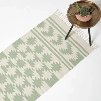 Turin handwoven kilim 100% cotton rug runner with geometric decorative design and tassels. Measuring 66 x 200 cm. Colour: Natural, Green. Expertly crafted by hand on a traditional loom from 100% cotton. Cotton is known for being a strong and durable material, and each strand has been tightly interwoven to create a durable kilim rug, perfect for heavy footfall areas. Complementing modern and traditional style interiors, this high-quality, durable, and hardwearing rug is suitable for bedrooms and living spaces. Easy to care for, this decorative rug can be machine-washed on a gentle cycle. Available in a choice of sizes including small (90 x 150 cm), medium (120 x 170 cm) and large (160 x 230 cm) rugs for living spaces as well as a hall runner (66 x 200 cm). A British brand, Homescapes are well respected for their top-quality homeware, furniture, soft furnishings and uncompromising service since the year 2000. Complete the look with our collection of co-ordinating home accessories and décor., Weight: 3.30693393 Pounds, Manufacturer: Homescapes