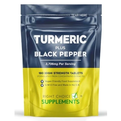 ✅ The Golden Pairing With Premium Concentration: Here's what sets us apart: 3206mg turmeric extract (35:1) delivering 95% curcuminoid concentration, paired with 500mg black pepper extract (10:1) in every 2-tablet serving. While most brands sell you basic turmeric powder with barely 3% curcumin content, we've chosen premium concentrated extract at 95% curcuminoids - and our thousands of loyal customers appreciate the quality difference. 180 tablets, 90-day supply. ✅ Why We Include Black Pepper Extract: Turmeric has centuries of traditional use behind it. Curcumin is the principal active compound in turmeric, but research shows it has naturally low bioavailability when taken alone. Black pepper extract (piperine) has been extensively studied in combination with curcumin - we've formulated these two ingredients together in carefully measured amounts based on published research ratios. ✅ Compact Size, Easy To Fit Into Your Day: Forget horse-pill capsules. Our 6mm tablets slip down easily with breakfast - no struggle, no discomfort. Crack open the pouch and the earthy warmth of authentic turmeric hits you immediately, backed by black pepper's subtle bite. That's real ingredients, not artificial flavouring or fillers. Everything inside is vegan-friendly: no gluten, wheat, dairy or GMOs. ✅ Space-Saving & Letterbox-Friendly Packaging: We've ditched bulky bottles for compact packaging that's perfect for your gym bag, handbag, or travel. By providing our turmeric tablets in flat pack packaging, we save on costly postage and storage fees associated with bottled turmeric capsules. Savings are passed on to you and allow us to invest more in sourcing premium ingredients, helping us provide our loyal customers quality supplements at honest prices. Better for you, better for the planet. ✅ Made In Britain, Trusted By Over 10,000 UK Customers: Every batch is crafted in the UK under strict certified quality standards - quality is our top priority. At Right Choice Supplements, we believe in straightforward, honest nutrition made from carefully selected ingredients we'd take ourselves. Active gym-goer? Busy professional? Parent juggling everything? Looking to stay active as you age? Our customers span every lifestyle, and they trust us day after day because quality matters when it comes to what you put in your body.