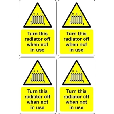 Turn this radiator off when not in use energy saving sign Self adhesive stickers Pack of 4 100mm x 66mm Digitally printed and laminated for extra durability Remove backing film and apply to dry smooth oil free surface