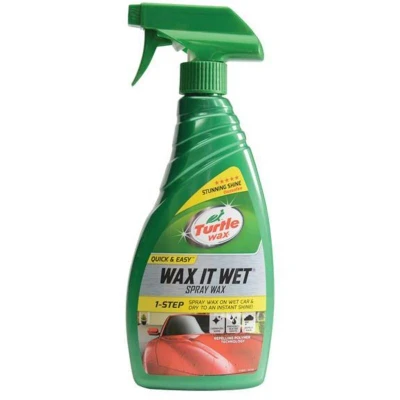 General description Turtle Wax 'Wax it Wet' Spray Wax is formulated with minute wax shine technology for an extremely quick way to achieve a smooth, slick finish. This unique formulation allows you to wax your car while it is drying, actively preventing water spots during application. It contains water-activated carnauba waxes and polymers that, once dry, leave a deep shine and protect the surface. Technical specifications Size: 500ml