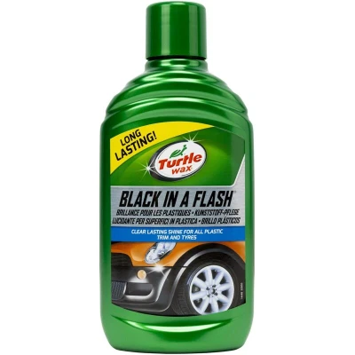 General description Turtle Wax Black in a Flash Trim and Tyre Wax is designed to restore faded plastics to their original condition. This product contains rich silicones and waxes, making it suitable for use on all exterior plastic, rubber, vinyl, and tyres. Its water-resistant formula ensures excellent durability, while the thick, non-drip gel provides a long-lasting deep gloss. Technical specifications Size: 300ml