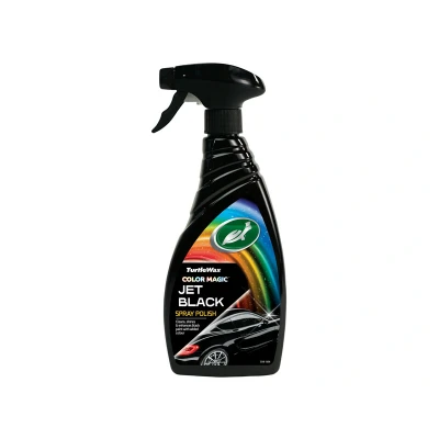 General description The Turtle Wax Jet Black Spray Polish is the fastest way to achieve a flawless black finish. Its color-enriched formulation quickly removes blemishes while providing maximum protection through synthetic polymers that bond strongly to the clear coat. This easy-to-use polish helps maintain a like-new shine in any weather condition.