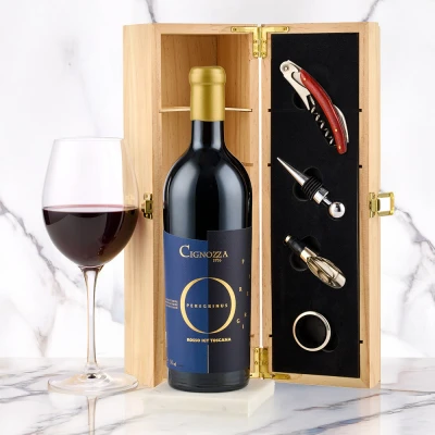 Luxury Italian Red Wine Gift Set – Featuring the prestigious Cignozza Peregrinus Toscana 75cl, this outstanding Super Tuscan red wine from the heart of Tuscany delivers bold flavours of ripe dark fruit, gentle spice, and a smooth, velvety finish. A perfect choice for those who appreciate fine Italian winemaking traditions. Premium Wooden Wine Box Presentation – Beautifully presented in a handcrafted wooden wine gift case, this set combines elegance with practicality. The wooden box not only enhances the sense of luxury but also serves as a lasting keepsake, making it an exceptional choice for luxury wine hampers, milestone celebrations, and collector’s displays. Complete Wine Accessories Collection – Designed to elevate the wine-drinking experience, the set includes a professional corkscrew, drip ring, wine stopper, and pourer. Each accessory ensures the ritual of opening, serving, and preserving fine wine is effortless and sophisticated—perfect for both casual enjoyment and connoisseur tasting. Perfect Gift for Wine Lovers & Connoisseurs – Whether you’re celebrating a birthday, anniversary, wedding, retirement, Christmas, or Father’s Day, this luxury wine gift box offers a thoughtful and impressive present. Also ideal for corporate gifting, making a refined statement of appreciation for valued clients and colleagues. Add a Personalised Gift Message: Make this gift even more special by adding your own unique message at checkout then have it delivered direct to their door.
