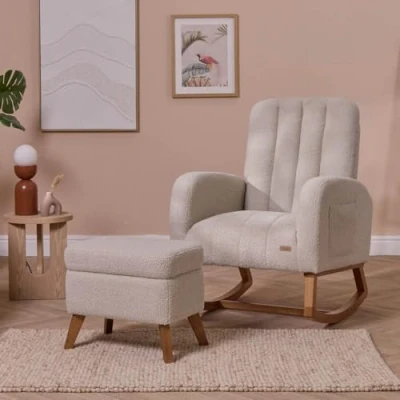ERGONOMIC COMFORT FOR FEEDING & RELAXING – Designed with a gently curved silhouette, supportive backrest cushion, and a deep, well-structured seat, the Tutti Bambini Luca rocking chair offers lasting comfort during feeding, cuddling, and story time. LUXURIOUS BOUCLÉ UPHOLSTERY – Wrapped in ultra-soft, teddy bouclé fabric that feels as comforting as it looks, this nursing chair adds warmth and texture to your space. Treated with Scotchgard for stain resistance and anti-static protection for everyday practicality. SUPPORTIVE SEAT & BACK DESIGN – Built with durable zigzag springs and deep cushioning, the Luca provides the perfect balance of softness and support, helping you stay comfortable through long feeds and late-night snuggles. SMOOTH, CALMING ROCKING MOTION – Solid rubberwood rocking legs deliver a gentle, soothing motion to help settle your baby and create calm, relaxing moments for both parent and child. PRACTICAL STORAGE SOLUTIONS – Includes a discreet side pocket on the chair for easy access to feeding essentials, books, or your phone, plus a matching footstool with hidden storage to keep blankets, toys, and nursery items neatly tucked away. DESIGNED FOR MODERN HOMES – With its sculpted wooden legs, curved lines, and cosy textures, the Luca rocking chair transitions effortlessly from nursery to living room, making it a timeless addition to any interior.