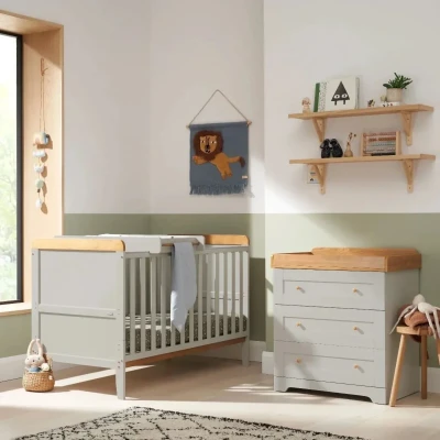 Why Buy Me? Tutti Bambini Rio 2 pcs Room Set is a long-lasting starter set for families who want to create a nursery that is both stylish and functional. The full-size cot bed is suitable from birth and features three adjustable mattress heights and protective teething rails, offering a safe and practical sleep space. As your child grows, it converts into a toddler bed, adapting to their changing needs over the years. The cot top changer makes daily nappy changes easier, while the spacious chest of drawers provides organised and easily accessible storage for baby essentials. Combining clean design with everyday practicality, this set offers an attractive, functional, and long-term nursery solution. Brand: Tutti Bambini Product Type: Furniture Set Product Sub-type: 2 Piece Furniture Sets Details : Intended Use • Designed to create a safe, organised and long-lasting nursery setup. • Combines sleeping, nappy changing and storage needs within one coordinated set. Age Range • The cot bed is suitable from birth up to approximately 6 years. • The cot top changer is suitable from birth up to approximately 15 kg. Cot Bed Features • Three adjustable mattress height positions adapt to your baby’s growth stages. • Converts from a cot bed into a toddler bed for extended use. • Teething rails help protect the cot sides. • Compatible with a standard 140 × 70 cm mattress (sold separately). Cot Top Changer • The cot top changer attaches securely to the cot, providing a practical nappy changing space. • Positions baby at a comfortable height to reduce strain on parents’ backs. • Removable when not in use to save space. Chest of Drawers • Spacious drawers provide organised storage for baby clothes and care essentials. • Allows easy access to everyday items. Material Composition • Cot bed and cot top changer are made from New Zealand pine and engineered wood. • Chest changer is made from engineered wood. • Finished with non-toxic surface coatings. Safety • Cot bed complies with relevant European/British safety standards. • Sturdy construction is designed for safe, long-term use. What’s Included • 1 x Rio Cot Bed • 1 x Cot Top Changer • 1 x Chest Changer (drawer unit) Dimensions: • Cot Bed Dimensions: H95 x L144.2 x W75 cm • Cot Bed Weight: 22 kg • Mattress Size: 140 x 70 cm (available to purchase separately) • Cot Bed Base Height Position 1: 22.9 cm • Cot Bed Base Height Position 2: 35.7 cm • Cot Bed Base Height Position 3: 48.5 cm • Height of space under the Cot Bed: 14.9 cm • Cot Top Changer Dimensions: L87.1 x W49 x H10 cm • Changing Mat Area: L76.5 x W46 cm • Cot Top Changer Weight: 3 kg • Chest Changer Dimensions: W79 x D50 x H88 cm • Chest Changer Weight: 33.3 kg • Chest Changer Internal Drawer Dimensions: W66 x D37 x H12 cm