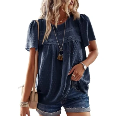 TUUHAW Navy Blue Tops for Women UK Short Sleeve Fashion Tunic Loose Flowy Summer Shirts Crewneck Chiffon Swiss Dot Blouses Cute Smocked Fit Boho Bardot Elegant Clothes XXXL