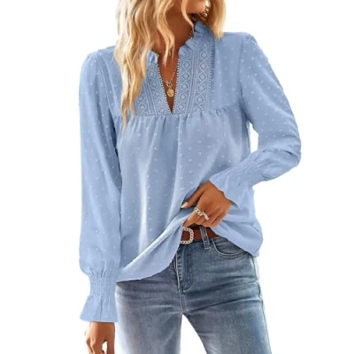 TUUHAW women's V-neck crochet lace tops are crafted from high-quality fabric that is soft, lightweight, and comfortable for all-day wear. Features: These stylish blouses offer a dressy casual look with a V-neck, elegant long sleeves, and chic crochet lace edges, enhanced by Swiss dot detailing. The non-see-through fabric adds a fashionable touch to your everyday outfit. Styling: You can effortlessly pair these tops with various coats, jackets, jeans, denim shorts, skirts, jeggings, and either casual trainers or heels to create a look you'll love throughout the season. Occasion: These smart-casual shirts are perfect for daily wear, outdoor activities, shopping, dates, and other events in spring, summer, autumn, and winter. Care Instructions: They can be hand washed or machine washed—if using a machine, place them in a wash bag. Either hang to dry or line dry as needed.