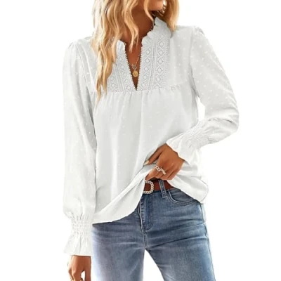 TUUHAW women's V-neck crochet lace tops are crafted from high-quality fabric that is soft, lightweight, and comfortable for all-day wear. Features: These stylish blouses offer a dressy casual look with a V-neck, elegant long sleeves, and chic crochet lace edges, enhanced by Swiss dot detailing. The non-see-through fabric adds a fashionable touch to your everyday outfit. Styling: You can effortlessly pair these tops with various coats, jackets, jeans, denim shorts, skirts, jeggings, and either casual trainers or heels to create a look you'll love throughout the season. Occasion: These smart-casual shirts are perfect for daily wear, outdoor activities, shopping, dates, and other events in spring, summer, autumn, and winter. Care Instructions: They can be hand washed or machine washed—if using a machine, place them in a wash bag. Either hang to dry or line dry as needed.