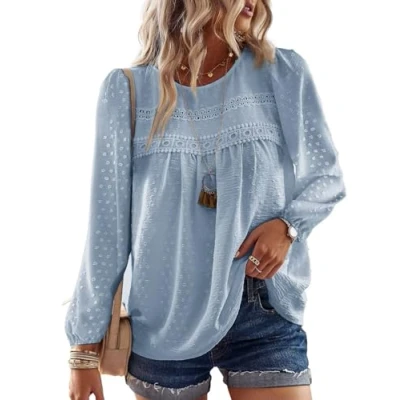 TUUHAW women's crew neck crochet lace boho shirt, crafted from high-quality fabric. This shirt is soft, lightweight, and designed for ultimate comfort throughout the day. Features:crew neck design,solid colour,long sleeves,delicate crochet lace edges,charming pom pom swiss dots detailingm,relaxed fit to enhance your energy and style. Styling Tips:Pair this fashionable blouse with a variety of outerwear, including coats and jackets, or match it with jeans, denim shorts, skirts, jeggings, sneakers, or heels for a versatile, casual look that you’ll love all year round. Occasions:This casual lace crochet shirt is the perfect choice for daily wear, outdoor activities, shopping trips, dates, and any other occasion throughout Spring, Summer, Fall, and Winter. Size Guide:Please refer to the Size Chart before placing your order. Hand or machine wash is recommended; hang to dry, and do not bleach.