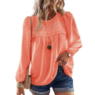 TUUHAW women's crew neck crochet lace boho shirt, crafted from high-quality fabric. This shirt is soft, lightweight, and designed for ultimate comfort throughout the day. Features:crew neck design,solid colour,long sleeves,delicate crochet lace edges,charming pom pom swiss dots detailingm,relaxed fit to enhance your energy and style. Styling Tips:Pair this fashionable blouse with a variety of outerwear, including coats and jackets, or match it with jeans, denim shorts, skirts, jeggings, sneakers, or heels for a versatile, casual look that you’ll love all year round. Occasions:This casual lace crochet shirt is the perfect choice for daily wear, outdoor activities, shopping trips, dates, and any other occasion throughout Spring, Summer, Fall, and Winter. Size Guide:Please refer to the Size Chart before placing your order. Hand or machine wash is recommended; hang to dry, and do not bleach.