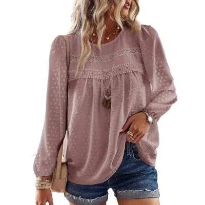 TUUHAW women's crew neck crochet lace boho shirt, crafted from high-quality fabric. This shirt is soft, lightweight, and designed for ultimate comfort throughout the day. Features:crew neck design,solid colour,long sleeves,delicate crochet lace edges,charming pom pom swiss dots detailingm,relaxed fit to enhance your energy and style. Styling Tips:Pair this fashionable blouse with a variety of outerwear, including coats and jackets, or match it with jeans, denim shorts, skirts, jeggings, sneakers, or heels for a versatile, casual look that you’ll love all year round. Occasions:This casual lace crochet shirt is the perfect choice for daily wear, outdoor activities, shopping trips, dates, and any other occasion throughout Spring, Summer, Fall, and Winter. Size Guide:Please refer to the Size Chart before placing your order. Hand or machine wash is recommended; hang to dry, and do not bleach.