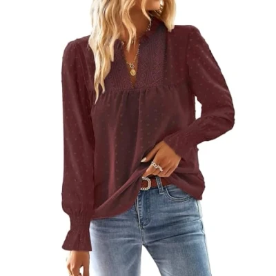 TUUHAW women's V-neck crochet lace tops are crafted from high-quality fabric that is soft, lightweight, and comfortable for all-day wear. Features: These stylish blouses offer a dressy casual look with a V-neck, elegant long sleeves, and chic crochet lace edges, enhanced by Swiss dot detailing. The non-see-through fabric adds a fashionable touch to your everyday outfit. Styling: You can effortlessly pair these tops with various coats, jackets, jeans, denim shorts, skirts, jeggings, and either casual trainers or heels to create a look you'll love throughout the season. Occasion: These smart-casual shirts are perfect for daily wear, outdoor activities, shopping, dates, and other events in spring, summer, autumn, and winter. Care Instructions: They can be hand washed or machine washed—if using a machine, place them in a wash bag. Either hang to dry or line dry as needed.