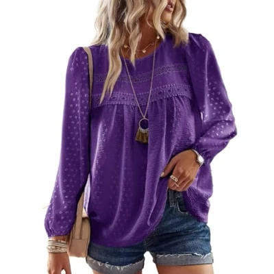 TUUHAW Tops for Women UK Long Sleeve Dark Purple Tunic Casual Crewneck Work Shirts Bohemian Blouses Smocked Lace Crochet Elegant Peasant Peplum Oversized M