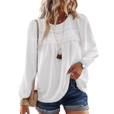 TUUHAW women's crew neck crochet lace boho shirt, crafted from high-quality fabric. This shirt is soft, lightweight, and designed for ultimate comfort throughout the day. Features:crew neck design,solid colour,long sleeves,delicate crochet lace edges,charming pom pom swiss dots detailingm,relaxed fit to enhance your energy and style. Styling Tips:Pair this fashionable blouse with a variety of outerwear, including coats and jackets, or match it with jeans, denim shorts, skirts, jeggings, sneakers, or heels for a versatile, casual look that you’ll love all year round. Occasions:This casual lace crochet shirt is the perfect choice for daily wear, outdoor activities, shopping trips, dates, and any other occasion throughout Spring, Summer, Fall, and Winter. Size Guide:Please refer to the Size Chart before placing your order. Hand or machine wash is recommended; hang to dry, and do not bleach.