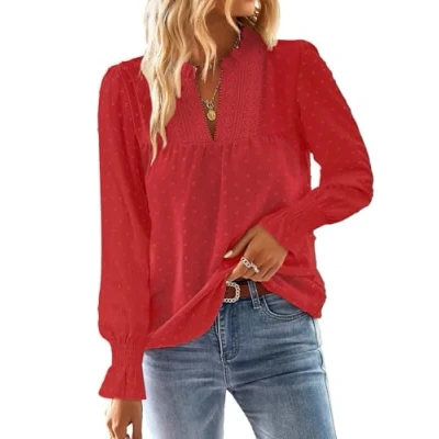 TUUHAW Womens Autumn Tops Sexy Smocked Babydoll Bohemian Blouse V Neck Flowy Chiffon Top with Lace Edges Long Sleeves Boho Office Work Tunic for Going Out in Winter Season Red M