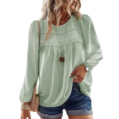TUUHAW women's crew neck crochet lace boho shirt, crafted from high-quality fabric. This shirt is soft, lightweight, and designed for ultimate comfort throughout the day. Features:crew neck design,solid colour,long sleeves,delicate crochet lace edges,charming pom pom swiss dots detailingm,relaxed fit to enhance your energy and style. Styling Tips:Pair this fashionable blouse with a variety of outerwear, including coats and jackets, or match it with jeans, denim shorts, skirts, jeggings, sneakers, or heels for a versatile, casual look that you’ll love all year round. Occasions:This casual lace crochet shirt is the perfect choice for daily wear, outdoor activities, shopping trips, dates, and any other occasion throughout Spring, Summer, Fall, and Winter. Size Guide:Please refer to the Size Chart before placing your order. Hand or machine wash is recommended; hang to dry, and do not bleach.