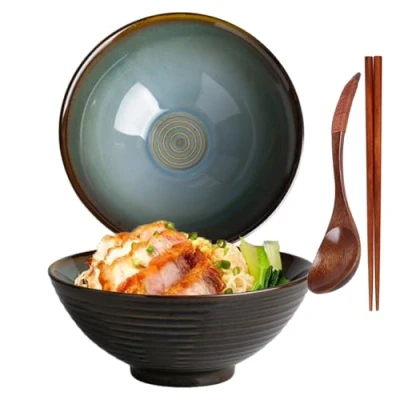 TuYines Ceramic Ramen Bowl, Bowl Set, Japanese with Spoon & Chopsticks, 1200 ml Soup Bowls, SaladBowl (Style B)