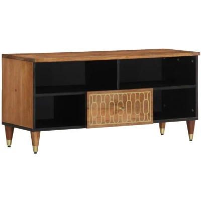 ManoManoGeneral description This sturdy TV cabinet is designed to be a focal point of your room with a trendy yet practical design. Made of solid mango wood, the TV stand is durable and stable, featuring beautiful wood grains that make each piece unique. The retro style, highlighted by hand-carved floral patterns, adds a touch of luxury to your interior. Technical specifications Material: Solid mango wood with honey brown finish, engineered wood, iron Dimensions: 100 x 33 x 46 cm (W x D x H) Assembly required: Yes Usage Spacious storage for magazines, DVDs, and other items Sturdy top for displaying decorative items like photo frames and plants Other information Each item is unique with variations in colors and grains Delivery is random, ensuring the exclusivity and individuality of your product