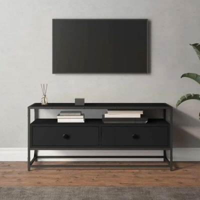 General description Featuring a stylish yet practical design, this TV cabinet is meant to become a focal point of your room. The engineered wood is of exceptional quality, providing strength, stability, and resistance to moisture. Technical specifications Colour: Black Material: Engineered wood, steel Dimensions: 100 x 35 x 45 cm (W x D x H) Assembly required: Yes Usage Ample storage space: Equipped with 2 drawers, the TV stand offers ample storage space to keep all your magazines, DVDs, and other items well organized. Sturdy top: The top of the TV unit provides a secure surface to display decorative objects, photo frames, or potted plants. Metal feet: The metal feet add a calm style to your interior while ensuring stability. Other information